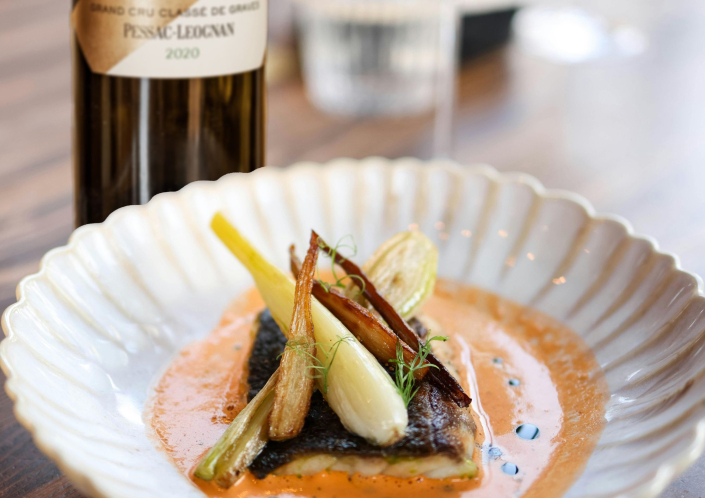 Dos de bar grillé sur peau, bisque de langoustine, légumes racines rôtis